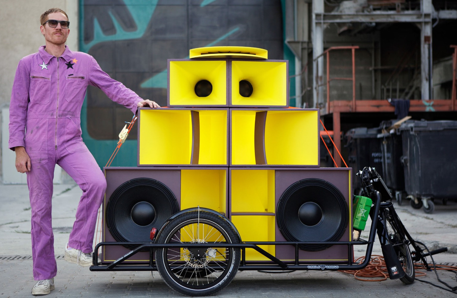 The DUBTRAIN.ONE is 100% self-sufficient, has a radius of about 60km and up to 14h playtime! It will amplify phono, line and microphone signals and has delay effects and a dub siren built in. It also features a LED lighting system. The overall weight including driver, bike, trailer, amplification, batteries, lights and speakers is around 420kg.